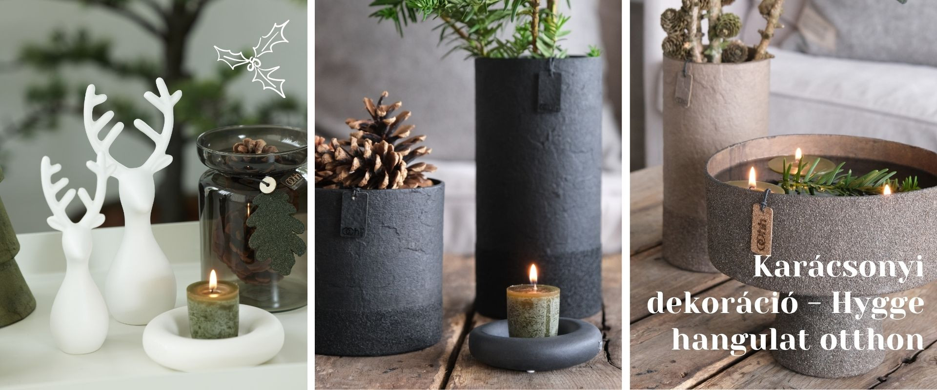 Legyen szó egy fa tálcán elrendezett kompozícióról, egy polcon álló kaspóról vagy egy elegáns váza–szarvas párosról, minden részlet a hygge nyugalmát idézi.