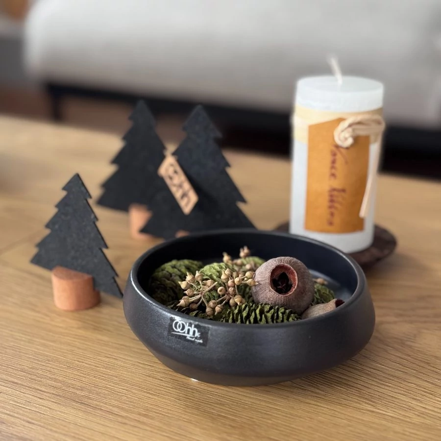 Tartalom 1 db Ania fekete tál, 1 db hófehér gyertya (5×10 cm), 1 db parafa tető, 1 szett (3 db) fekete ökofilc fenyő fa talppal
