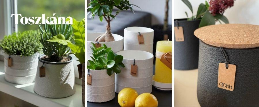 A Toszkána kollekciót az olasz életérzés inspirálta – letisztult formavilág, természetes árnyalatok (fekete és fehér), és egy olyan bőrhatású felület, ami igazán egyedi karaktert kölcsönöz minden darabnak. A formák között találunk kúpos kaspókat, valamint egyenes, hengeres vázákat és kaspókat is, több méretben – így bármilyen térbe könnyedén beilleszthetők. Legyen szó nappaliról, dolgozószobáról, előszobáról vagy konyháról, ezek a tárgyak egyszerre praktikusak és dekoratívak.